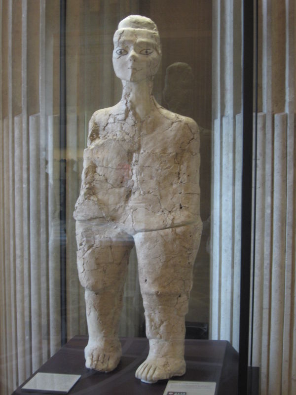 The statue I am talking about is a Neolithic lime plaster and reed statue dated between the mid-7th millennium BC and the mid-8th millennium BC. It was discovered along with other similar statues in ‘Ain Ghazal (Jordan) in 1985 and it is among the earliest representation of the human form. While the body is quite stylized and disproportioned (quite tall but extremely flat, about 10 cm in thickness) a great effort was put into modelling the face, with wide-open eyes and bitumen-outlined irises. The elongated head also suggests the presence of a some sort of wig that added more details. The technique used to create it was simple but ingenious: the maker created a reed skeleton and then modelled the moist plaster around it. Since the reed decayed over the millennia, leaving a plaster shell with a hollow interior, to preserve the statue it was necessary to replace the core with a new invisible skeleton. This task was extremely delicate and the restoration work took a lot of time.